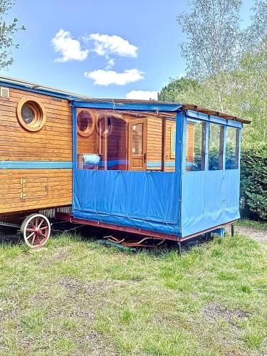 Blue: La Roulotte du Médoc là chỗ nghỉ có hồ bơi ngoài trời theo mùa, khu vườn và sân hiên, nằm ở Naujac-sur-Mer, cách Cửa sông Gironde 42 km, Nhà thờ Basilique Notre-Dame de la Fin des Terres 33 km và Méjanne Golf Course 43 km.