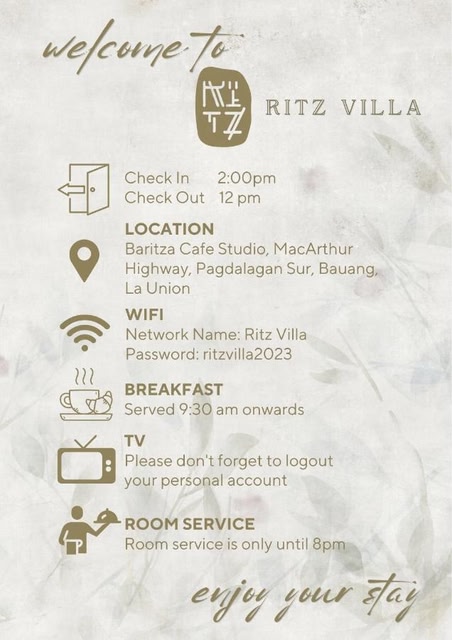 Tọa lạc ở Bauang thuộc Luzon, Ritz Villa cung cấp Wi-Fi miễn phí, chỗ đậu xe riêng miễn phí và bể sục. Tất cả các căn có phòng tắm riêng, vòi xịt/chậu rửa vệ sinh, điều hòa, TV màn hình phẳng và tủ lạnh.