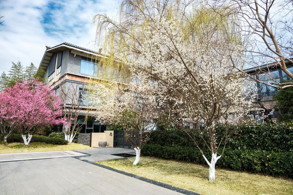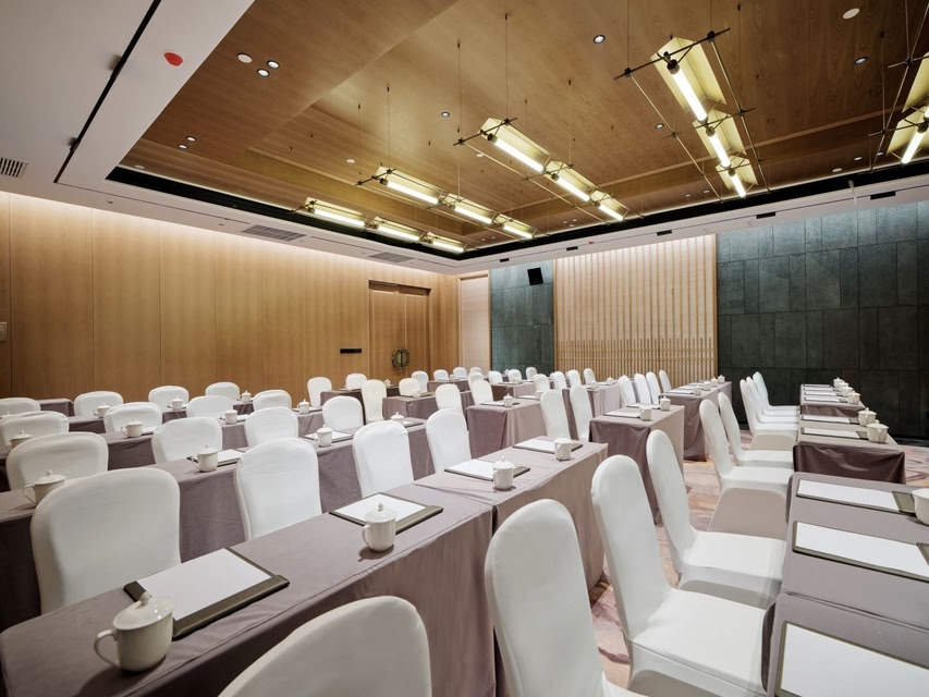 Located in Zone A1 of Tianhan Changjie, Binjiang New District, Hanzhong City, adjacent to Tianhan Bridge and integrated into Tianhan Cultural Wetland Park, this high-end business, leisure, and garden-style hotel is elegantly situated along the river. Spanning approximately 14,900 square meters, the hotel's main structure features an enclosed courtyard layout ("Hui" shape), continuing the architectural style of Tianhan Changjie. Its interior design emphasizes spacious, symmetrical spaces with meticulous material selection. A color scheme dominated by black, accented with gold and red, embodies contemporary trends in garden resort aesthetics—grounded yet dynamic. Equipped with central air conditioning and underfloor heating throughout, the hotel ensures a cozy stay even in extreme weather. The hotel offers diverse room types, including family-friendly vacation rooms, courtyard suites with private hot springs, duplex rooms with activity zones, pet-friendly accommodations, and fully-equipped suites. Rooms range from 40 to 95 square meters on average, with the expansive Yunjing Suite covering nearly 500 square meters indoors and outdoors. The Chinese restaurant, styled in modern luxury, features 10 intimate private dining rooms, two multifunctional banquet halls accommodating 6-14 tables each, and a 500-square-meter outdoor lawn for varied event needs. The all-day dining area provides 120 seats and a VIP private room for 10 guests, offering lavish decor and exquisite à la carte or buffet options. Additional amenities include an indoor golf simulator, outdoor driving range, cigar lounge, fitness area, and coffee/tea lounge, delivering diverse leisure experiences.